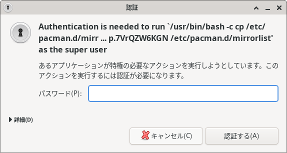 「Arch」系は、よくリポジトリの更新に失敗したりします。  何より、初回ログイン時、ミラーの更新はやっておくべきです。  ログイン後に、デフォルトで表示される下記のダイアログで(画像は、「XFCE」のもの)  「ミラーの更新」(赤枠内)