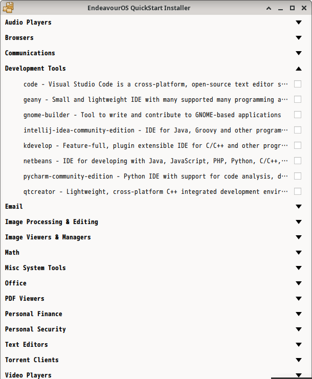 カテゴリを開きます。 ここでは、試しに「Development Tools」を開いてみます。。 チェックして、「Install Now」で、インストールできるようです。 「Visual Studio Code」は、ここにあるようです。 (ただし、これでインストールするのは「Code OSS」になります、これは、インストールしないように) しかしまぁ、カテゴリを探すのも大変です。 なのでわたしは。「root」ユーザ権限で、「pacman」を使用して、パッケージを管理します。 「pacman」の使用方法に関しては、「パッケージ管理 - Arch 系 pacman」をご参照ください。 |