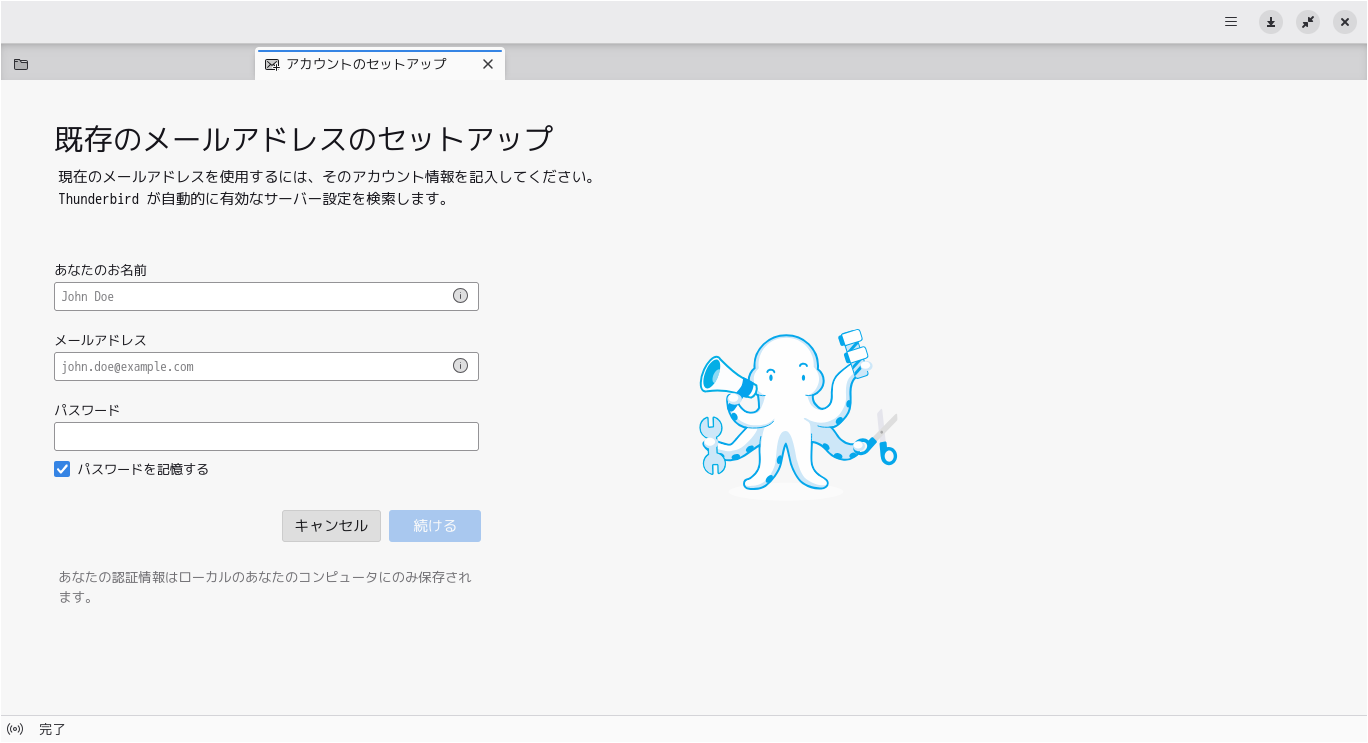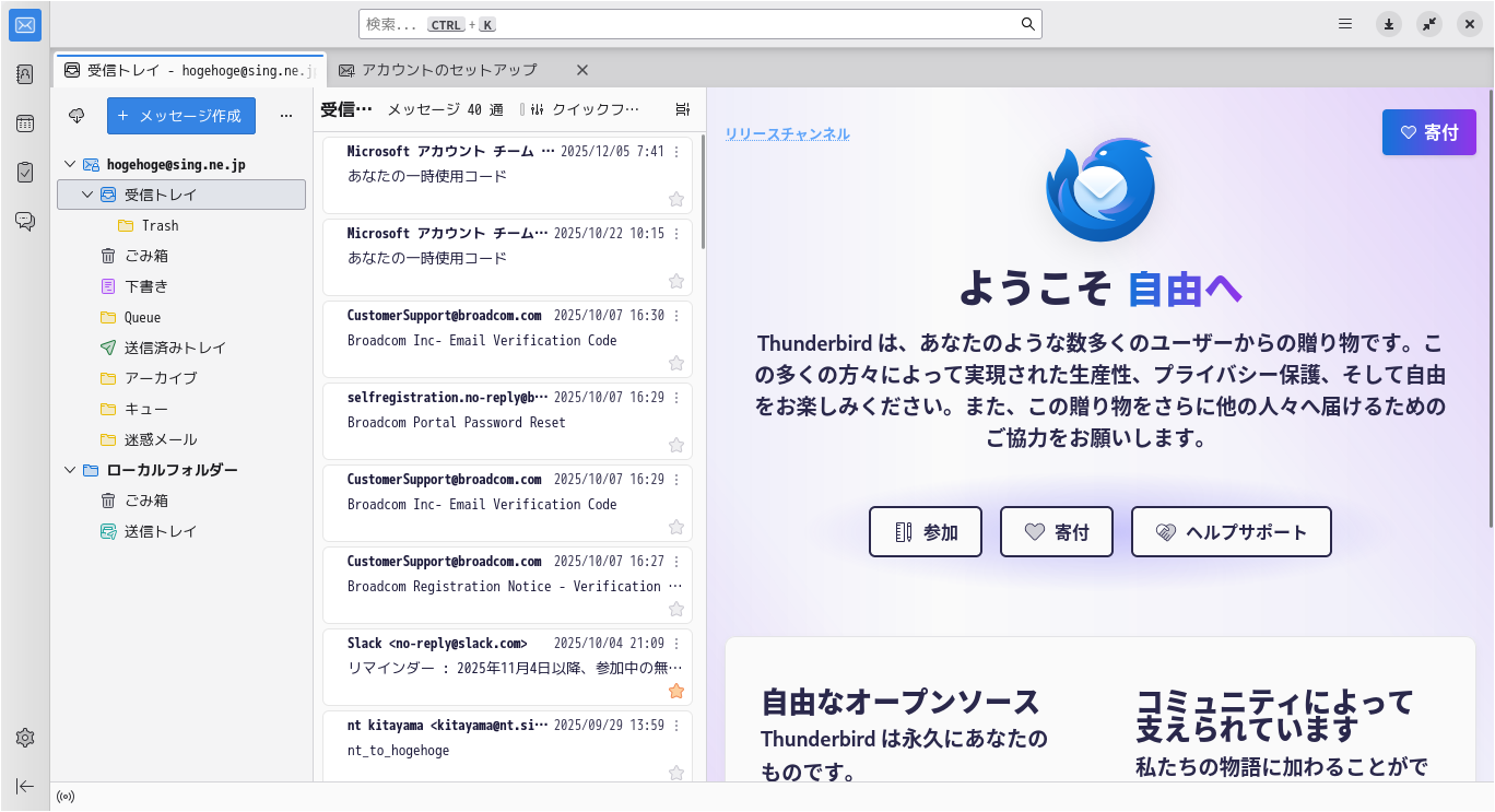 初回起動時は、「メールアドレスのセットアップ」から始まります。 起動直後の状態です。 2026年3月13日の時点で、下記のバージョンでした。 メールアドレスのセットアップ他、操作に関しては、「メール クライアント ソフト - Thunderbird」をご参照ください。 |