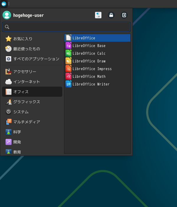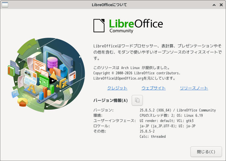 1. 概要 オフィススイートとして、「LibreOffice」を使用します。 2. インストール 「root」ユーザ権限で。 yes | pacman -S libreoffice-still-ja 3. 起動 「スタート」→「オフィス」→「LibreOffice」