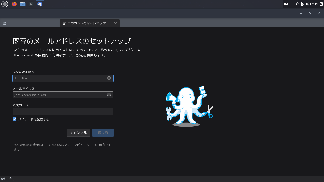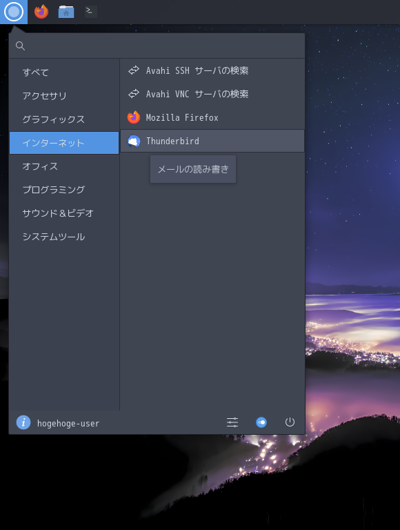 デフォルトでは、メールクライアントは、インストールされていません。  「Thunderbird」をインストールして、使用します。  「メールアアドレスのセットアップ」他、操作については、「メール クライアント ソフト - Thunderbird」をご参照ください。