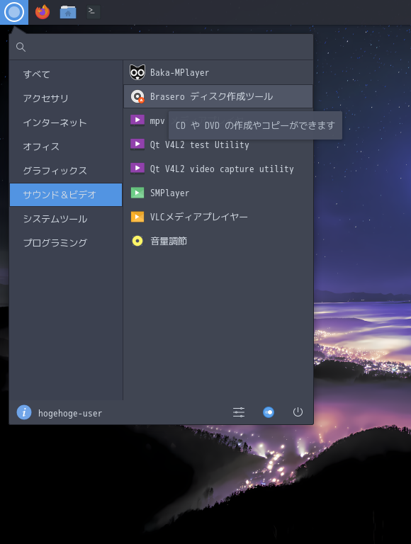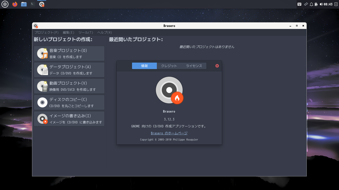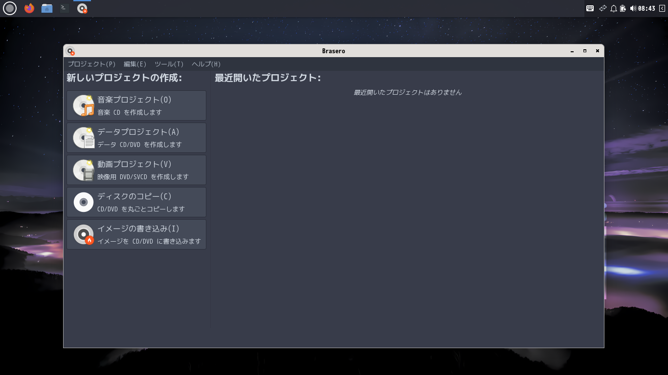 1. 概要 光ディスク(CD・DVD)のライティングソフトとして、「Brasero」を使用します。 2. インストール 「root」ユーザ権限で。 yes | pacman -S brasero 3. 起動 「スタート」→「サウンドとビデオ」→「Brasero」