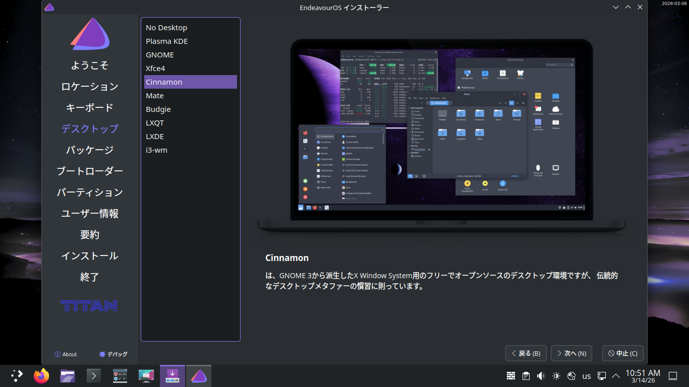 1. インストール インストールに関しては、「EndeavourOS - 2026.03.06 - 共通事項」をご参照ください。 インストール時のデスクトップ選択で、「Cinnamon-Desktop」にチェックをいれることで、「Cinnamon」をインストールできます。