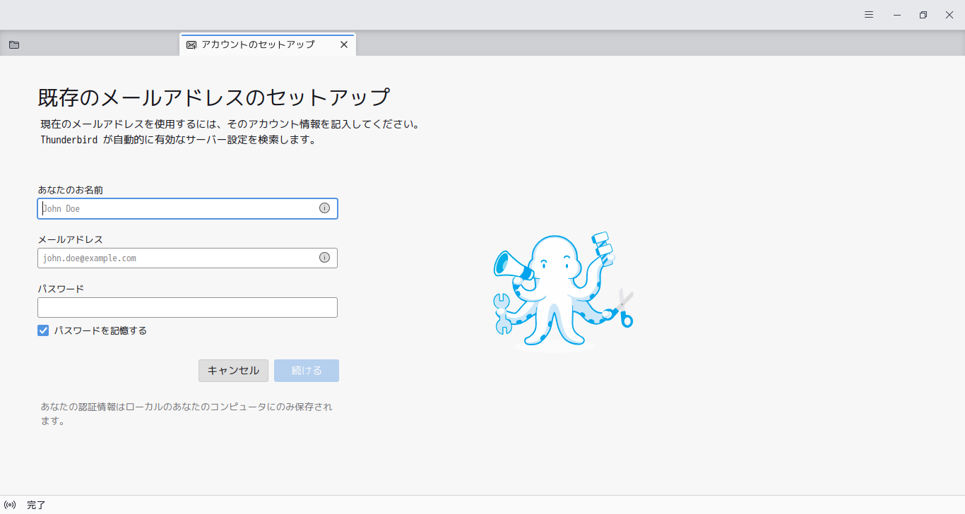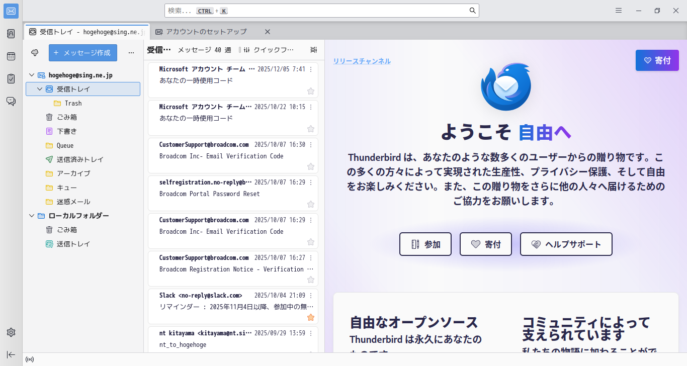 初回起動時は、「メールアドレスのセットアップ」から始まります。 起動直後の状態です。 2026年3月14日の時点で、下記のバージョンでした。 メールアドレスのセットアップ他、操作に関しては、「メール クライアント ソフト - Thunderbird」をご参照ください。 |