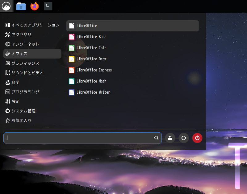 「LibreOffice」は、「Welcome」画面よりインストールできますが、後で、日本語化パッケージをインストールする必要があるので、はなから「pacman」でインストールします。