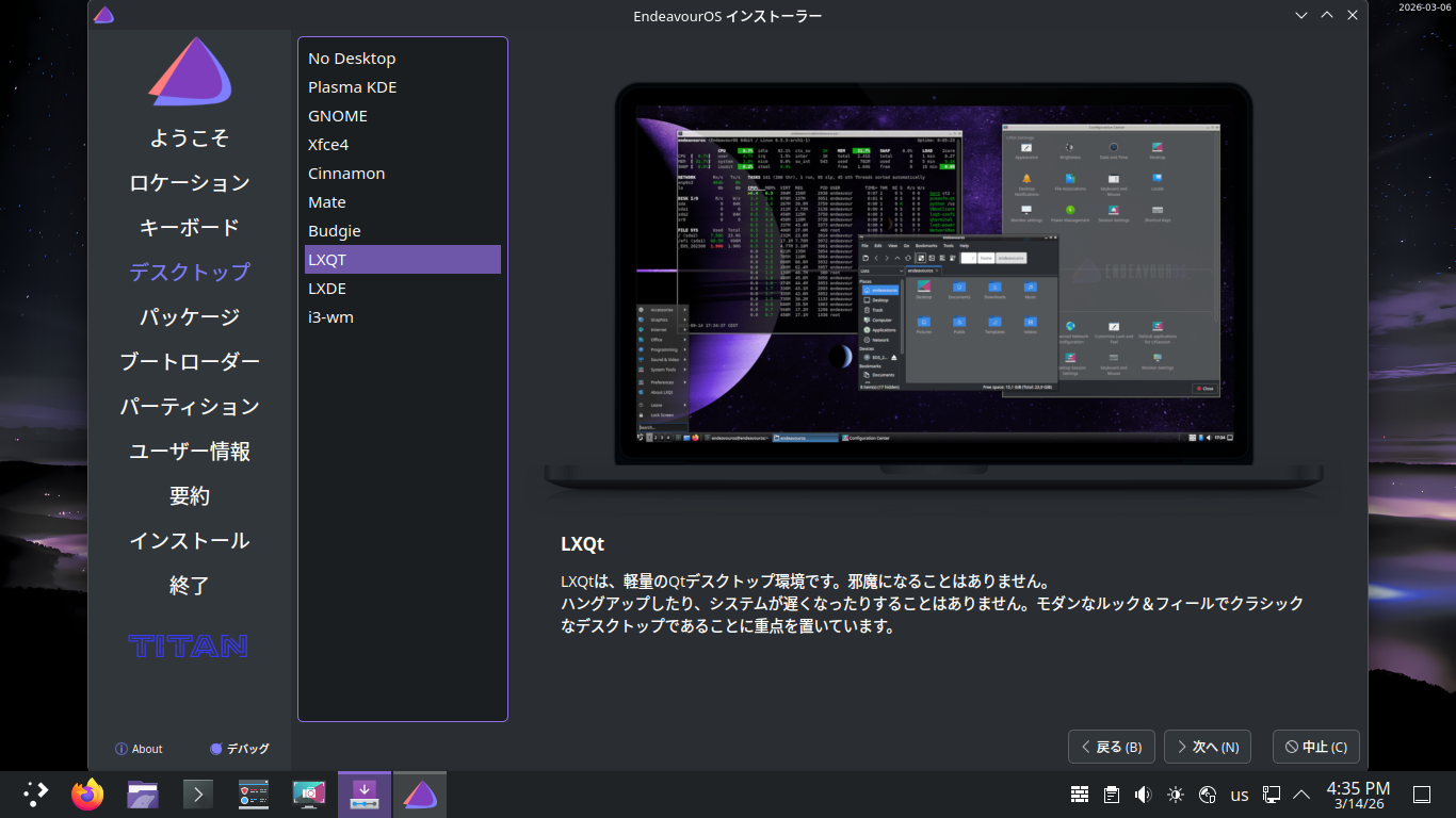 1. 概要 インストールに関しては、「EndeavourOS - 2026.03.06 - 共通事項」をご参照ください。 2. インストール インストール時のデスクトップ選択で、「LXQt」にチェックをいれることで、「LXQt」をインストールできます。