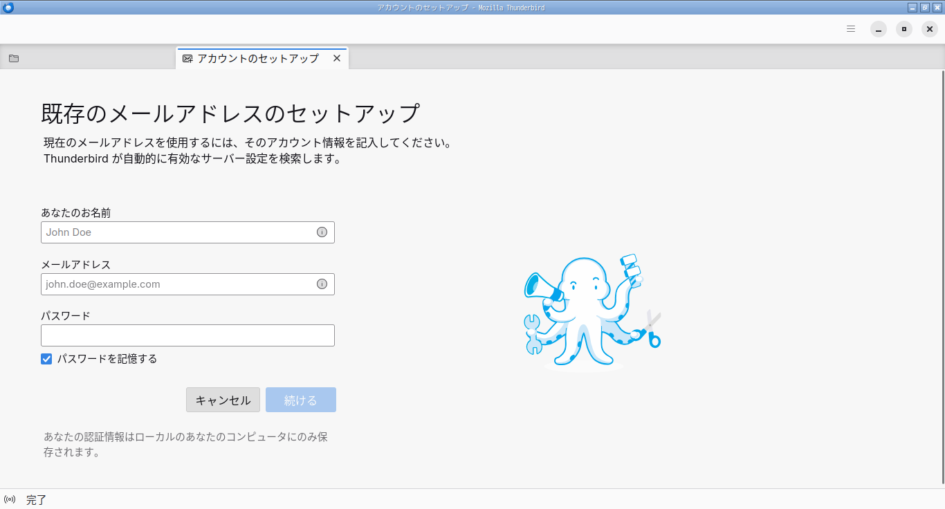 初回起動時は、「メールアドレスのセットアップ」から始まります。 起動直後の状態です。 2026年3月16日の時点で、下記のバージョンでした。 メールアドレスのセットアップ他、操作に関しては、「メール クライアント ソフト - Thunderbird」をご参照ください。 |