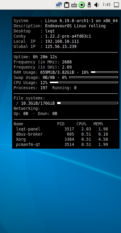 再ログイン後に、デスクトップ右に、「Conky」の表示が現れます。