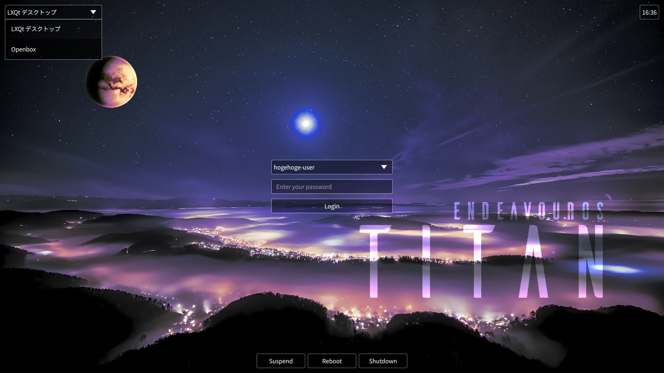 1. インストール インストールに関しては、「EndeavourOS - 2026.03.06 - 共通事項」をご参照ください。 「Openbox」は、明示的に選択肢はありません。 「LXQt」もしくは「LXDE」をインストールすると、漏れなくついてきます。 2. セッション選択 ログイン画面で「Openbox」を選択すれば、「Openbox」の環境へログインできます。