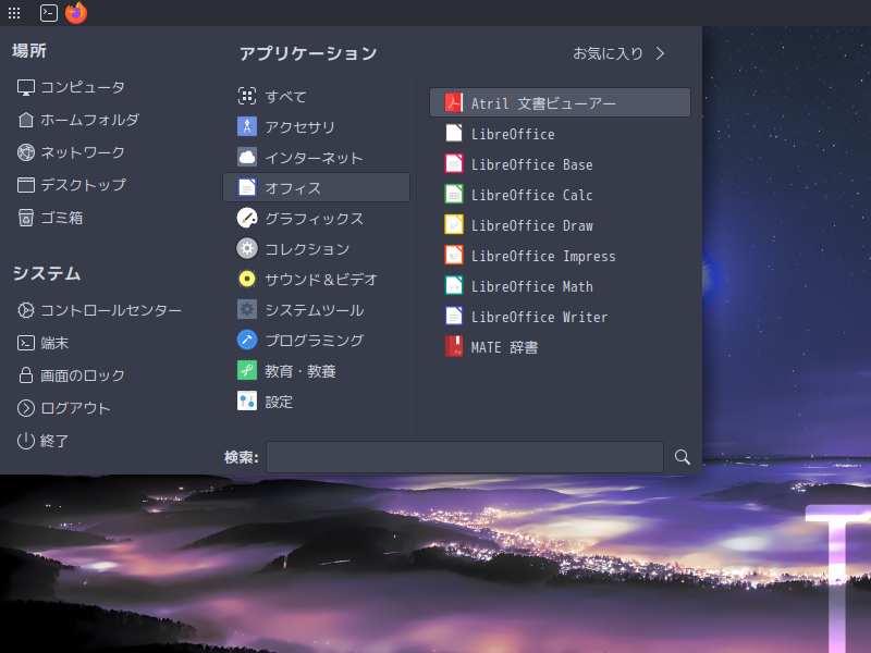 1. 概要 ドキュメントビューアとして、「Atril」を使用します。 「Atril」は、「MATE」のドキュメントビューアです。 デフォルトでインストールされています。 2. 起動 「スタート」→「オフィス」→「Atril ドキュメントビューア」