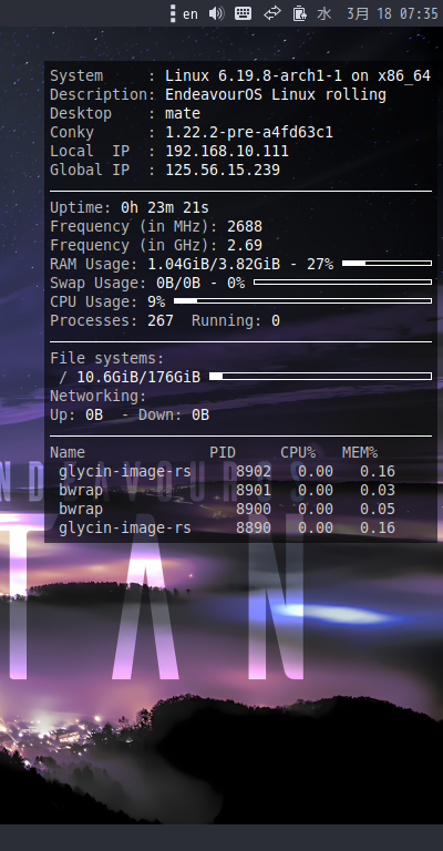 再ログイン後に、デスクトップ右に、「Conky」の表示が現れます。