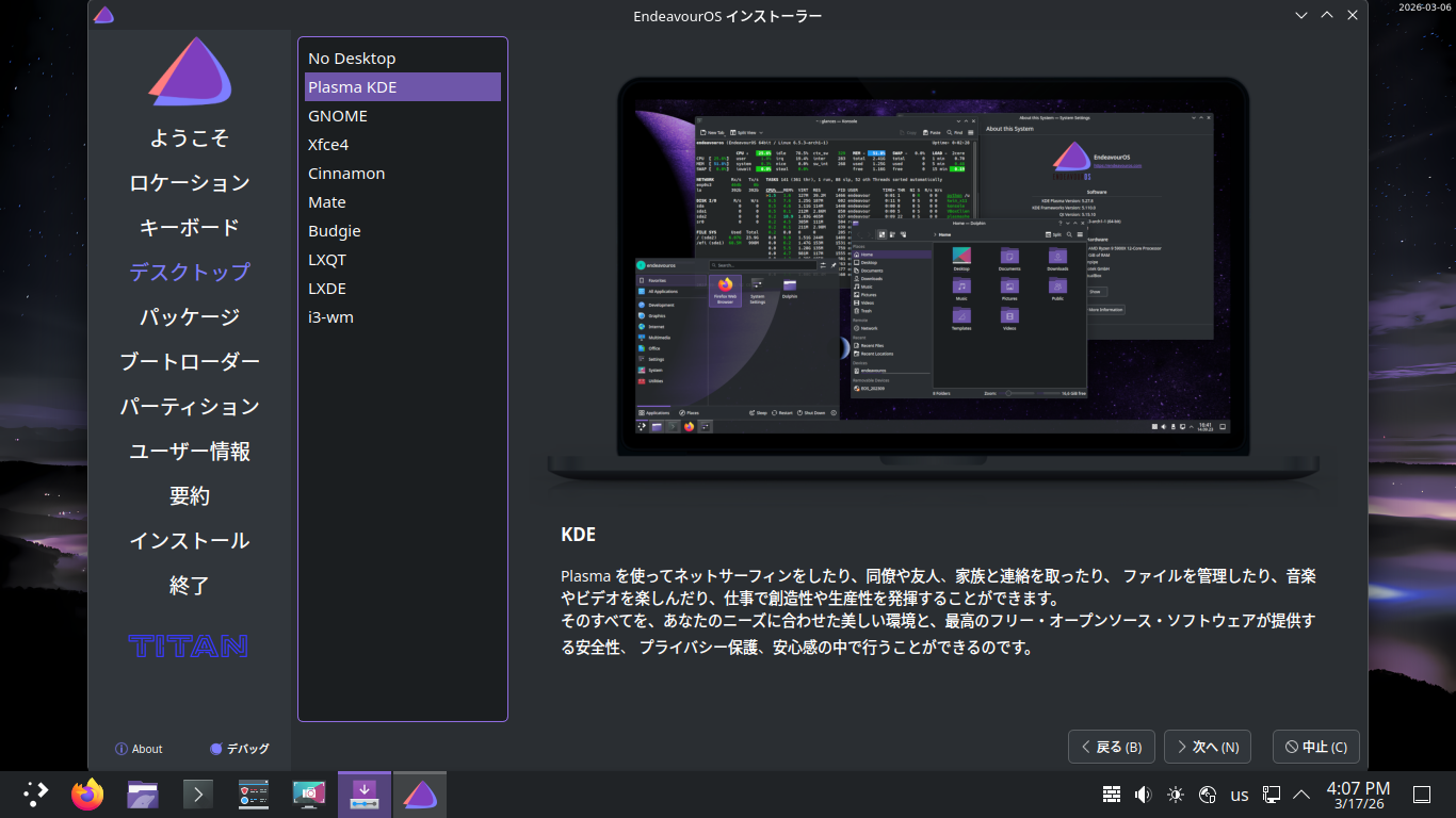 EndeavourOS - 2026.03.06 - KDE - インストール