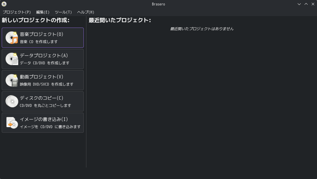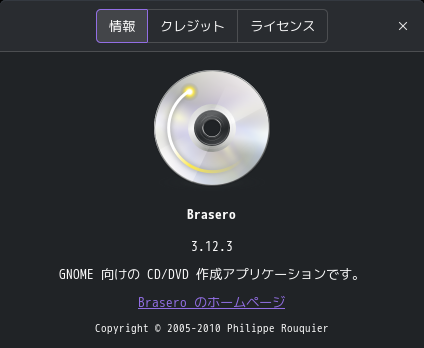 1. 概要 光ディスク(CD・DVD)のライティングソフトとして、「Brasero」を使用します。 2. インストール 「root」ユーザ権限で。 yes | pacman -S brasero 3. 起動 「スタート」→「マルチメディア」→「Brasero」