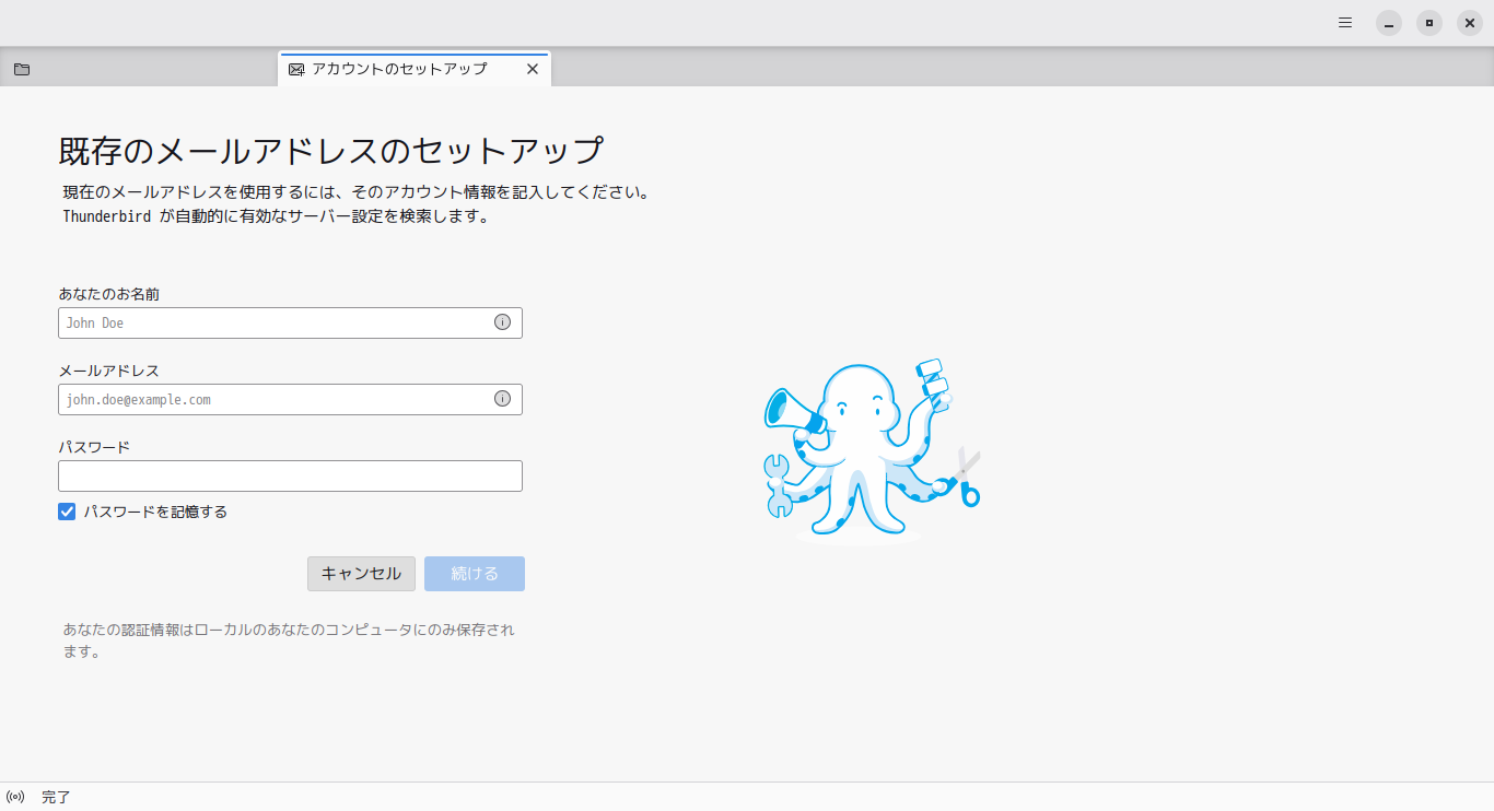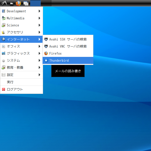 デフォルトでは、メールクライアントは、インストールされていません。  「Thunderbird」をインストールして、使用します。  「メールアアドレスのセットアップ」他、操作については、「メール クライアント ソフト - Thunderbird」をご参照ください。