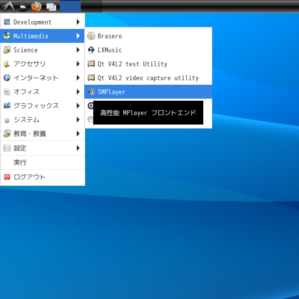 1. 概要 マルチメディアプレイヤーとして、「SMPlayer」を使用します。 2. インストール root」ユーザ権限で。 yes | pacman -S smplayer 3. 起動 「スタート」→「Mulitimedia」→「SMPlayer」