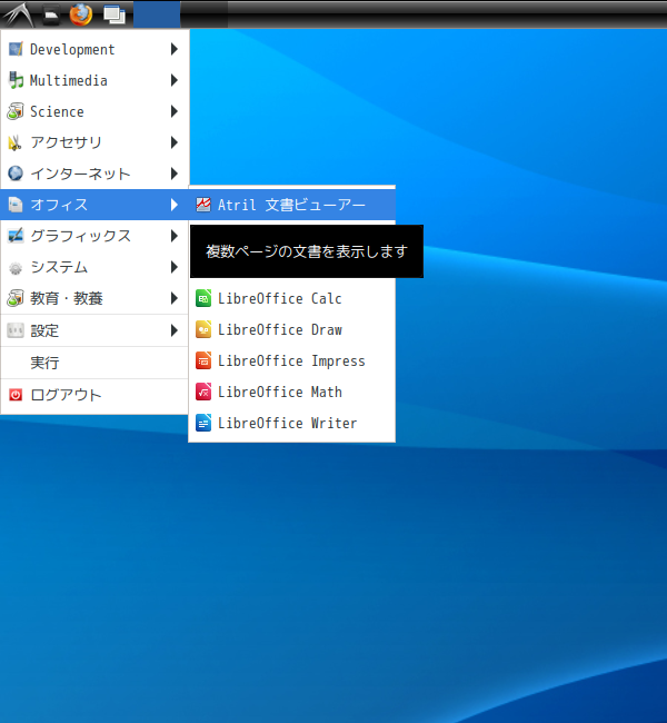 1. 概要 ドキュメントビューアとして、「Atril」を使用します。 2. インストール 「root」ユーザ権限で。 yes | pacman -S atril 3. 起動 「スタート」→「オフィス」→「Atril」