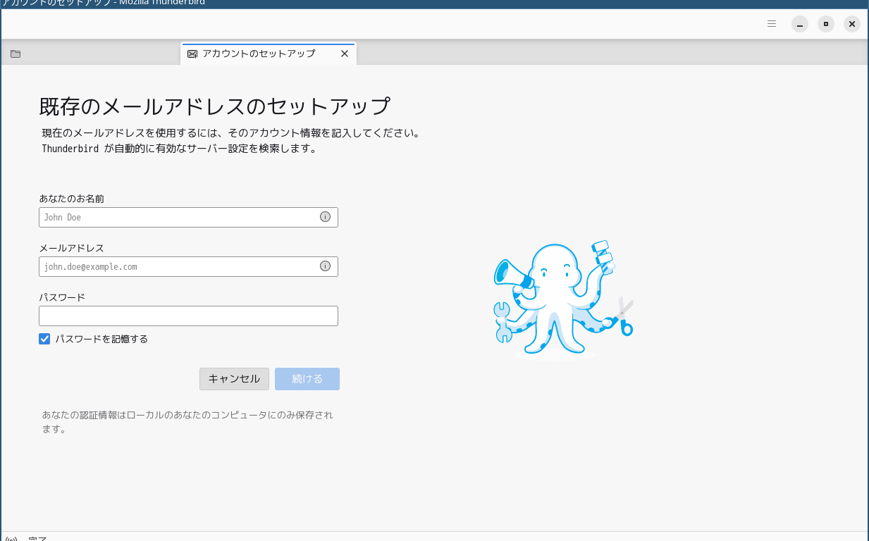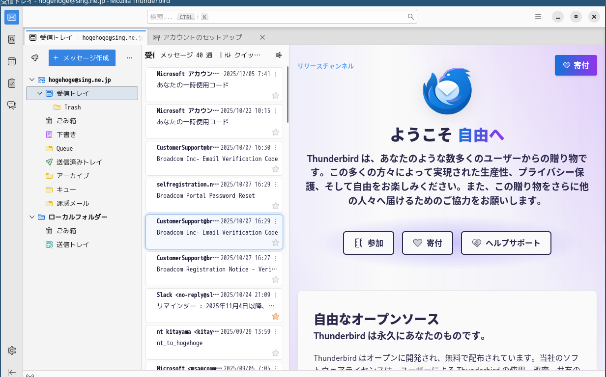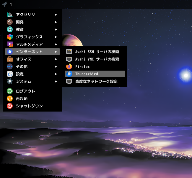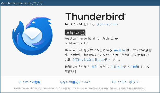 1. 概要 デフォルトでは、メールクライアントは、インストールされていません。 「Thunderbird」をインストールして、使用します。 「メールアアドレスのセットアップ」他、操作については、「メール クライアント ソフト - Thunderbird」をご参照ください。 2. インストール 「root」ユーザ権限で。 yes | pacman -S thunderbird-i18n-ja 3. 起動 「スタート」→「インターネット」→「Thunderbird」