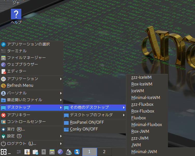 デフォルトで有効になっているのは、「ROX-IceWM」ですが、デフォルトで、「Fluxbox」「JWM」も同時にインストールされています。
