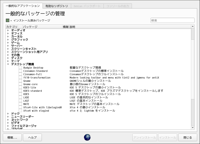 「デスクトップ環境」を開くと、インストール可能なデスクトップの一覧が開きます。