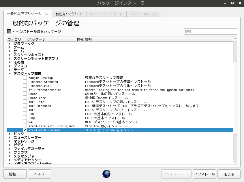 他のデスクトップ環境をインストールするには、「パッケージインストーラ」を使用するのが、一番確実で楽な方法だと思います。