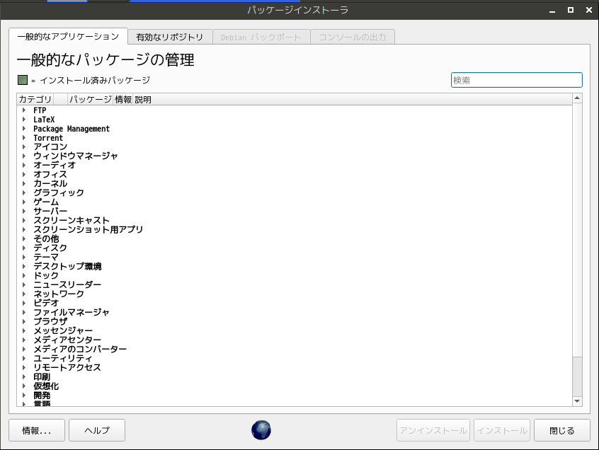 基本的に、日本語モジュールと他のデスクトップのインストールには、「パッケージインストーラ」を使用、一般のアプリケーションのインストールには、「Synaptic」を使用するという使い分けがいいと思います。2024年10月8日