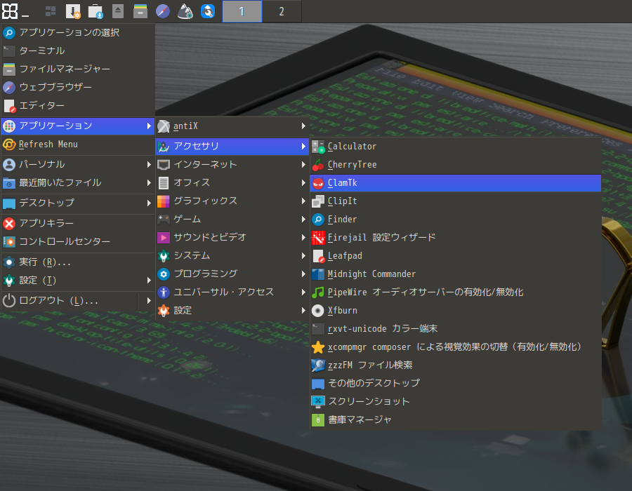 「スタート」→「アプリケーション」→「アクセサリ」→「ClamTk」