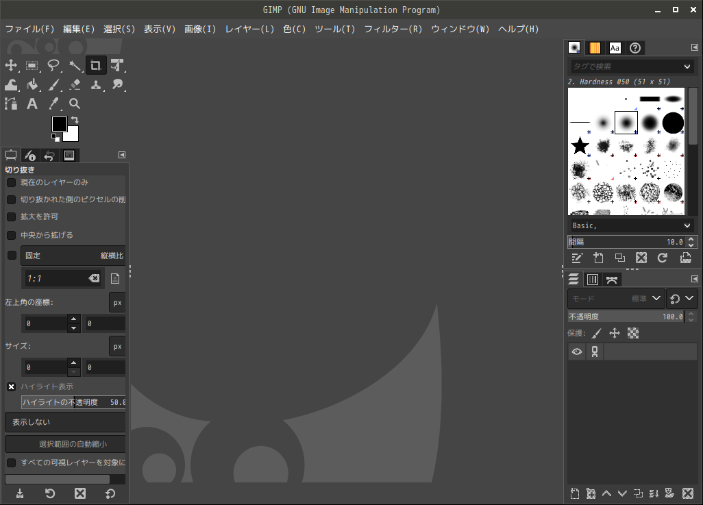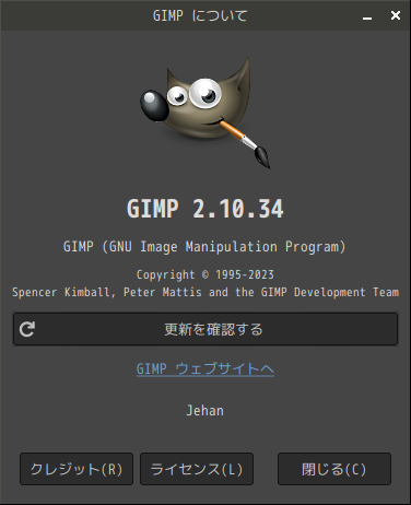 起動直後の状態です。 2024年10月8日の時点で、下記のバージョンでした。 操作については、「画像編集ソフト GIMP2」に掲載しています。 上記は簡単なものですので、詳細なものがほしい方は、各所に初歩の手引きから応用編までありますので、そちらを参考にしてください。 |