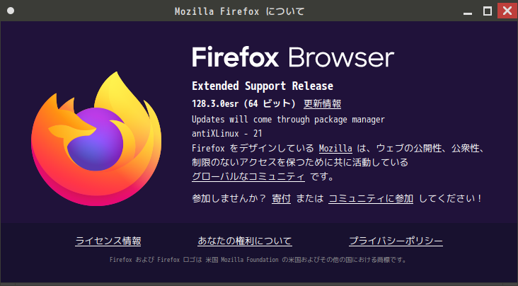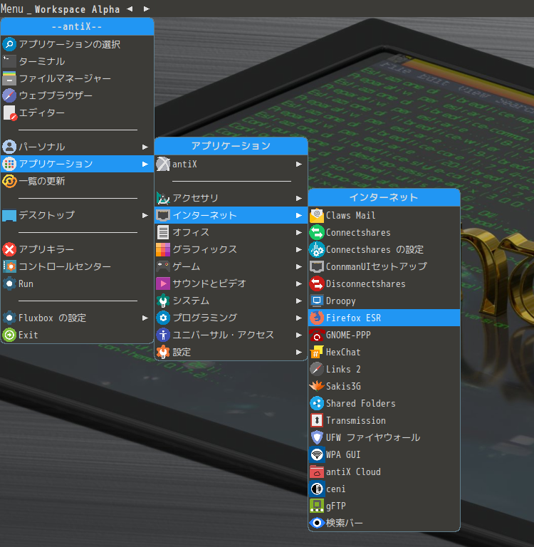 1. 概要 ブラウザとして、「Firefox」が、デフォルトでインストールされています。 2. 起動 「Menu」→「アプリケーション」→「インターネット」→「Firefox」