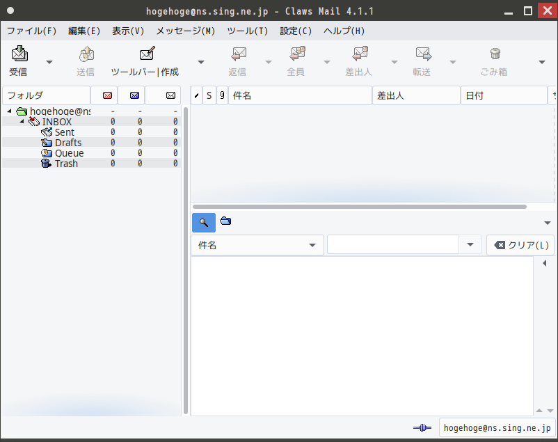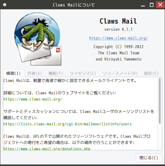 初回起動時は、「設定ウィザード」から始まります。 起動直後の状態です。 2024年10月8日の時点で、下記のバージョンでした。 操作方法の詳細等は「メールクライアント - Claws Mail」でどうぞ。 |