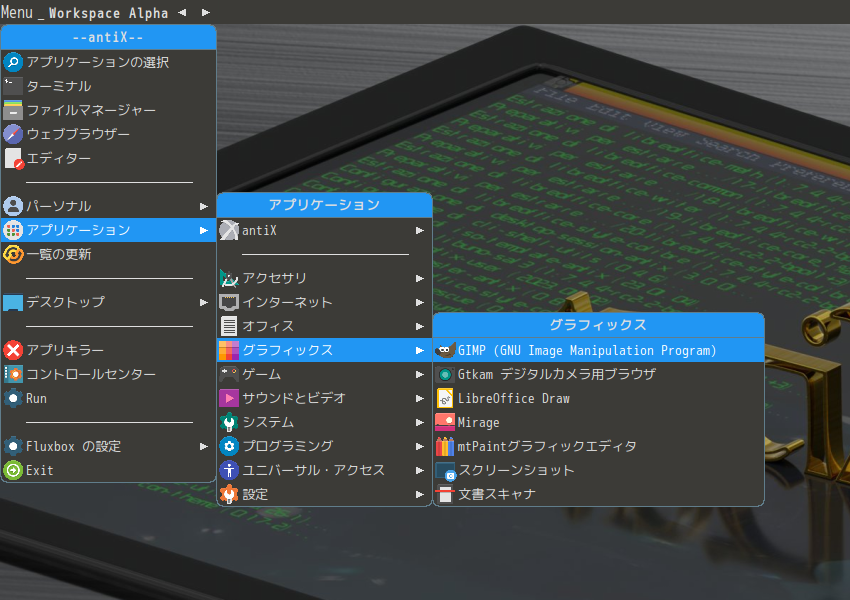 「antiX 23.2 Fluxbox」-「Menu」→「アプリケーション」→「グラフィックス」→「GIMP」