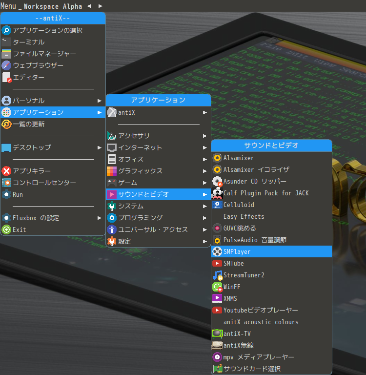 「Menu」→「アプリケーション」→「サウンドとビデオ」→「SMPlayer」