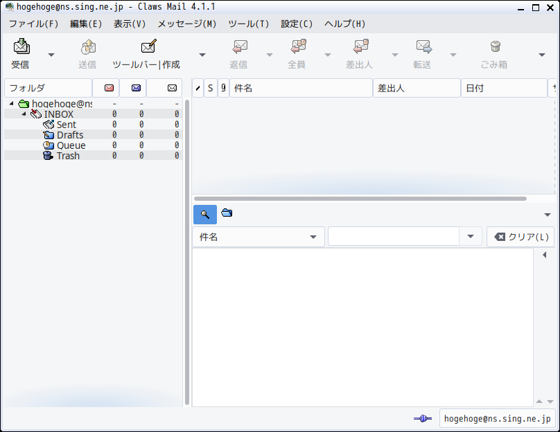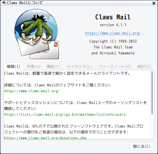 初回起動時は、「設定ウィザード」から始まります。 起動直後の状態です。 2024年10月9日の時点で、下記のバージョンでした。 操作方法の詳細等は「メールクライアント - Claws Mail」でどうぞ。 |