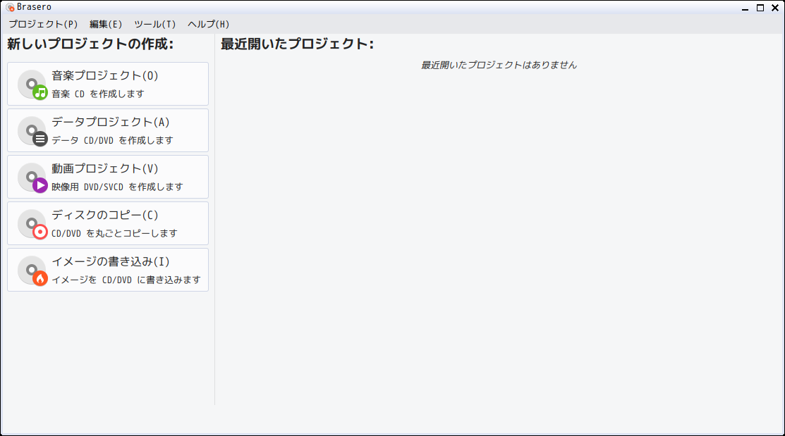 1. 概要 光ディスクライティングソフトとして、「Brasero」を使用します。 2. インストール 「Synaptic」で、「brasero」を検索して、インストールできます。 3. 起動 「スタート」→「アプリケーション」→「サウンドとビデオ」→「Brasero」