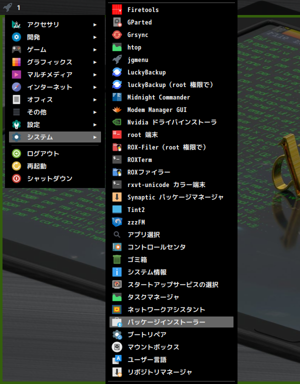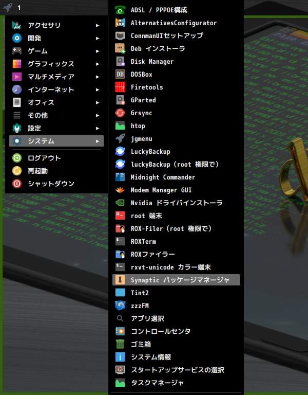 パッケージ管理フロントエンドとして「パッケージインストーラ」「Synaptic」がインストールされています。