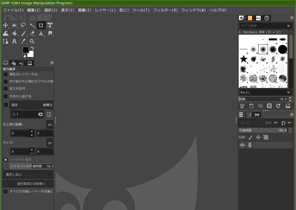 起動直後の状態です。 2024年10月10日の時点で、下記のバージョンでした。 操作については、「画像編集ソフト GIMP2」に掲載しています。 上記は簡単なものですので、詳細なものがほしい方は、各所に初歩の手引きから応用編までありますので、そちらを参考にしてください。 |