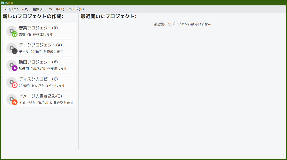 1. 概要 光ディスクライティングソフトとして、「Brasero」を使用します。 2. インストール 「Synaptic」で、「brasero」を検索して、インストールします。 3. 起動 「スタート」→「マルチメディア」→「Brasero」