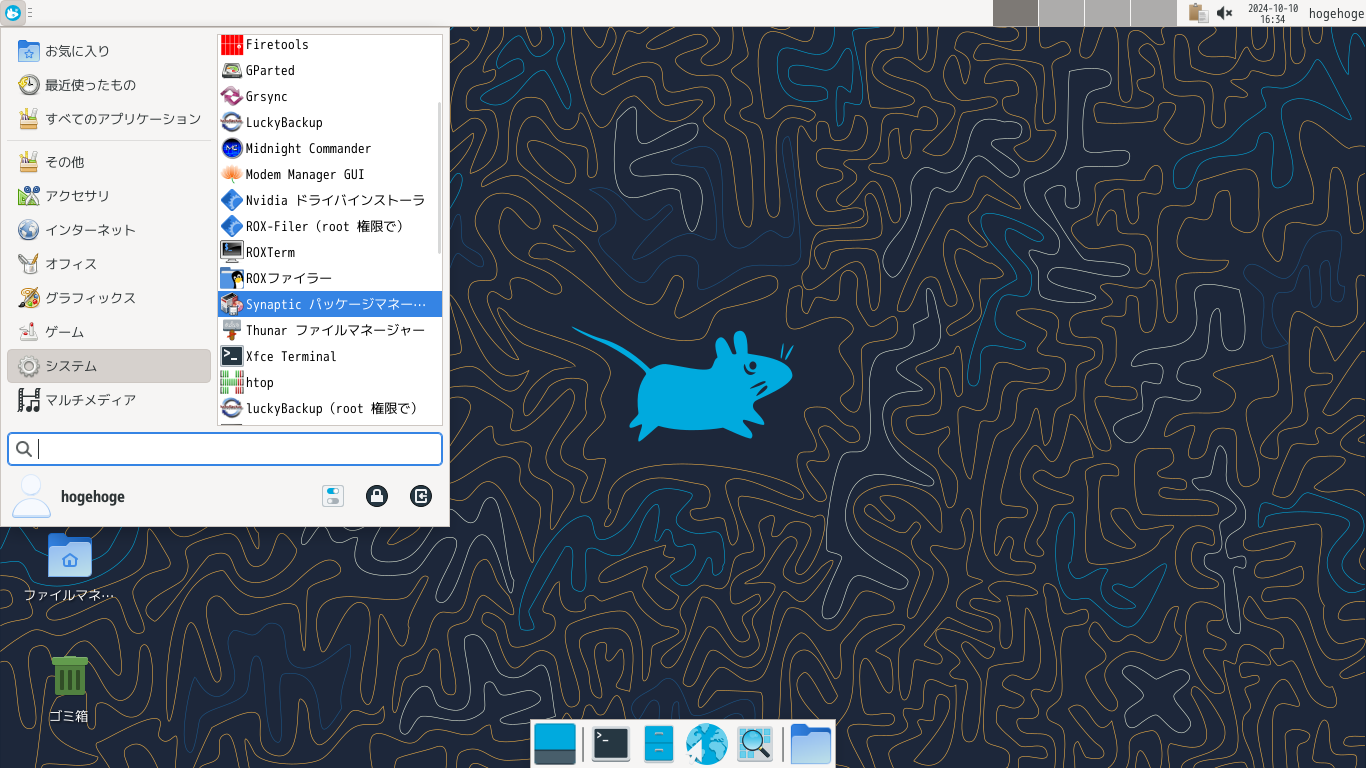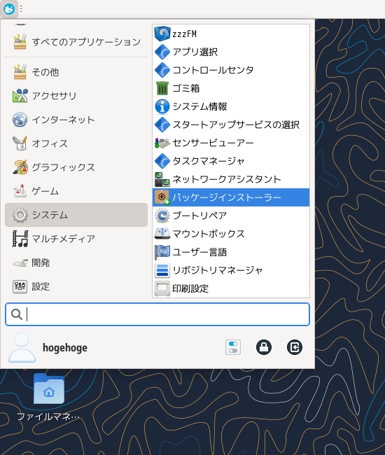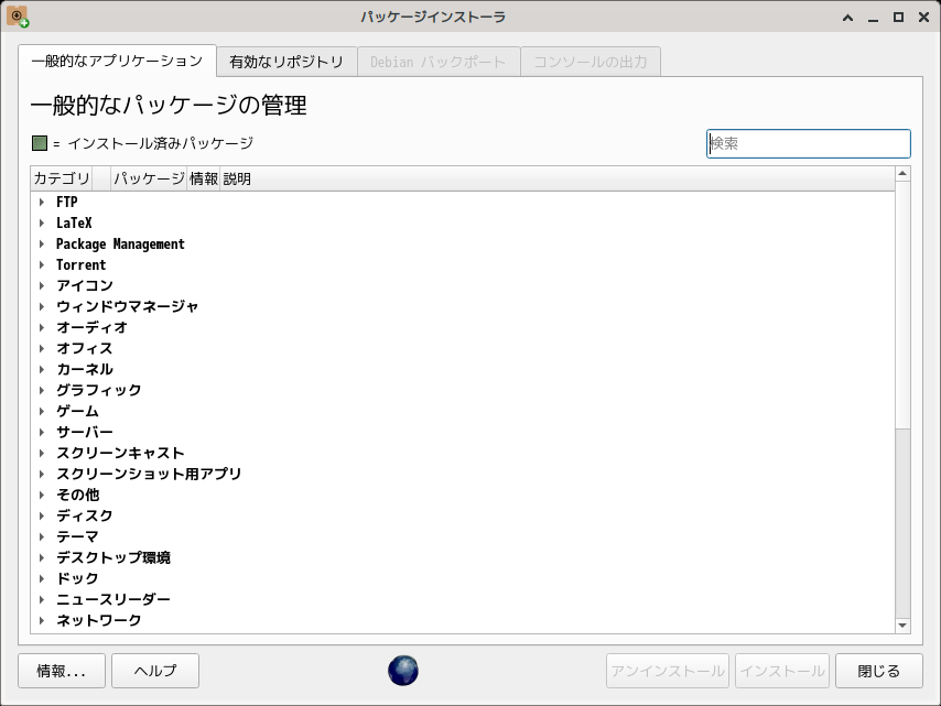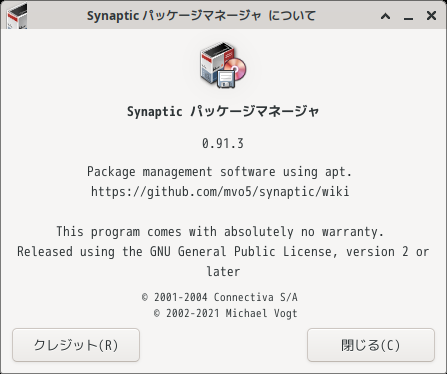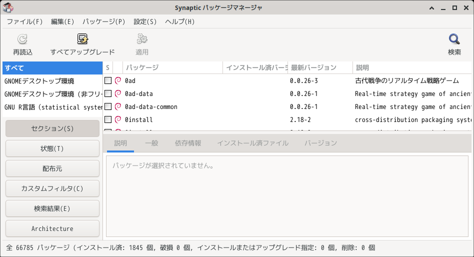 パッケージ管理フロントエンドとして「パッケージインストーラ」「Synaptic」がインストールされています。