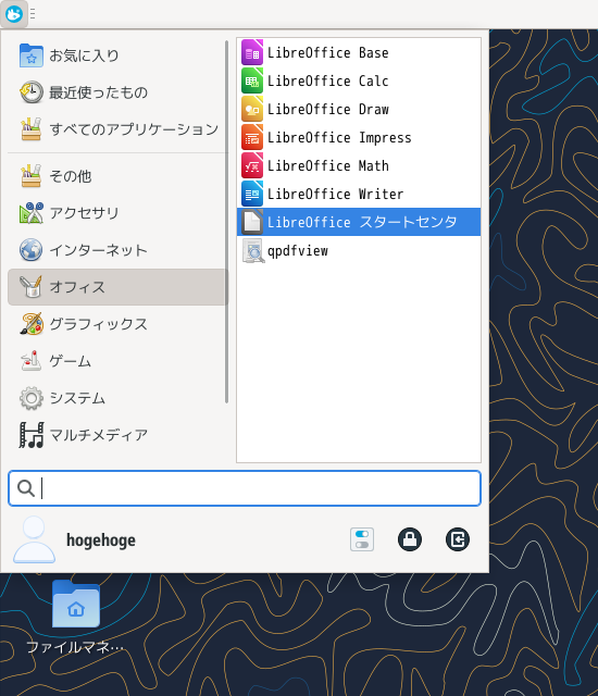 1. 概要 オフィススイートとして「LibreOffice」を使用します。 「LibreOffice」は、デフォルトでインストールされています。 2. 日本語化 インストールされている「LibreOffice」は英語版なので、日本語化する必要があります。 「パッケージインストーラ」で「japanese」を検索して「Japanese_LO_Latest_full」「Japanese_LO_Latest_main」をインストールします。 3. 起動 「スタート」→「オフィス」→「LibreOffice スタートセンタ」