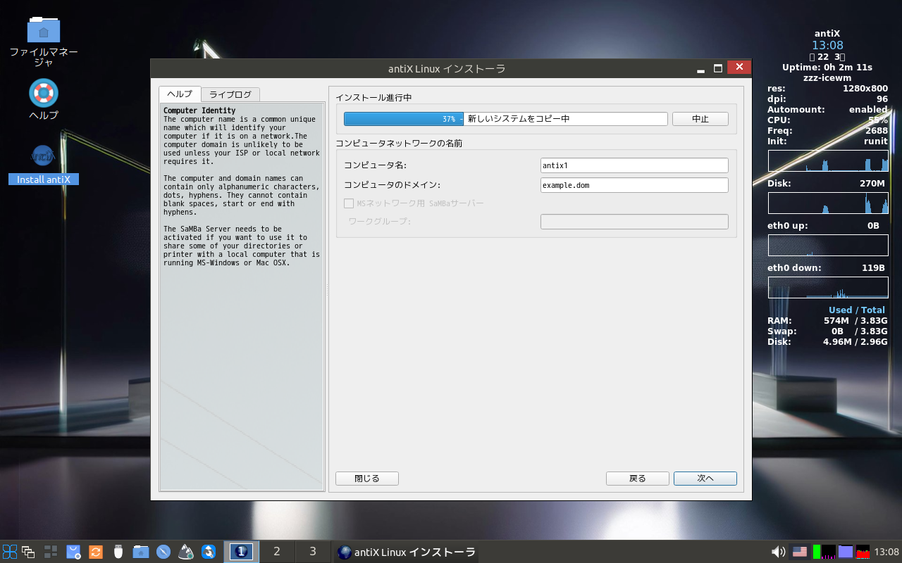 コンピュータ名、ドメインを入力して
