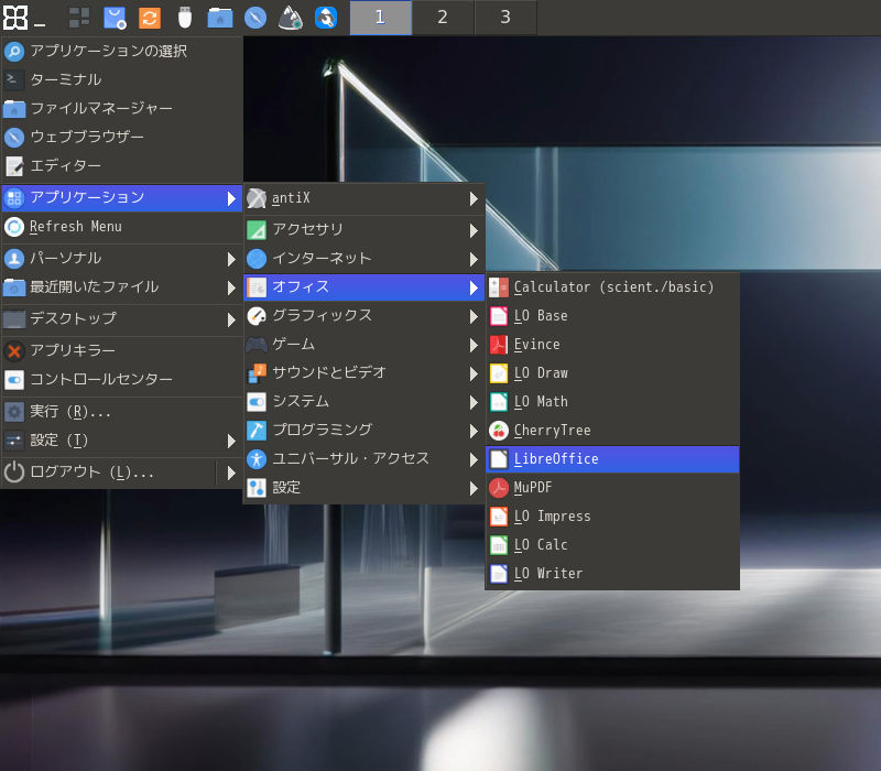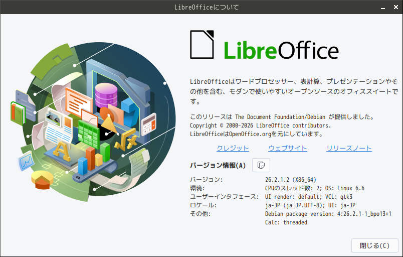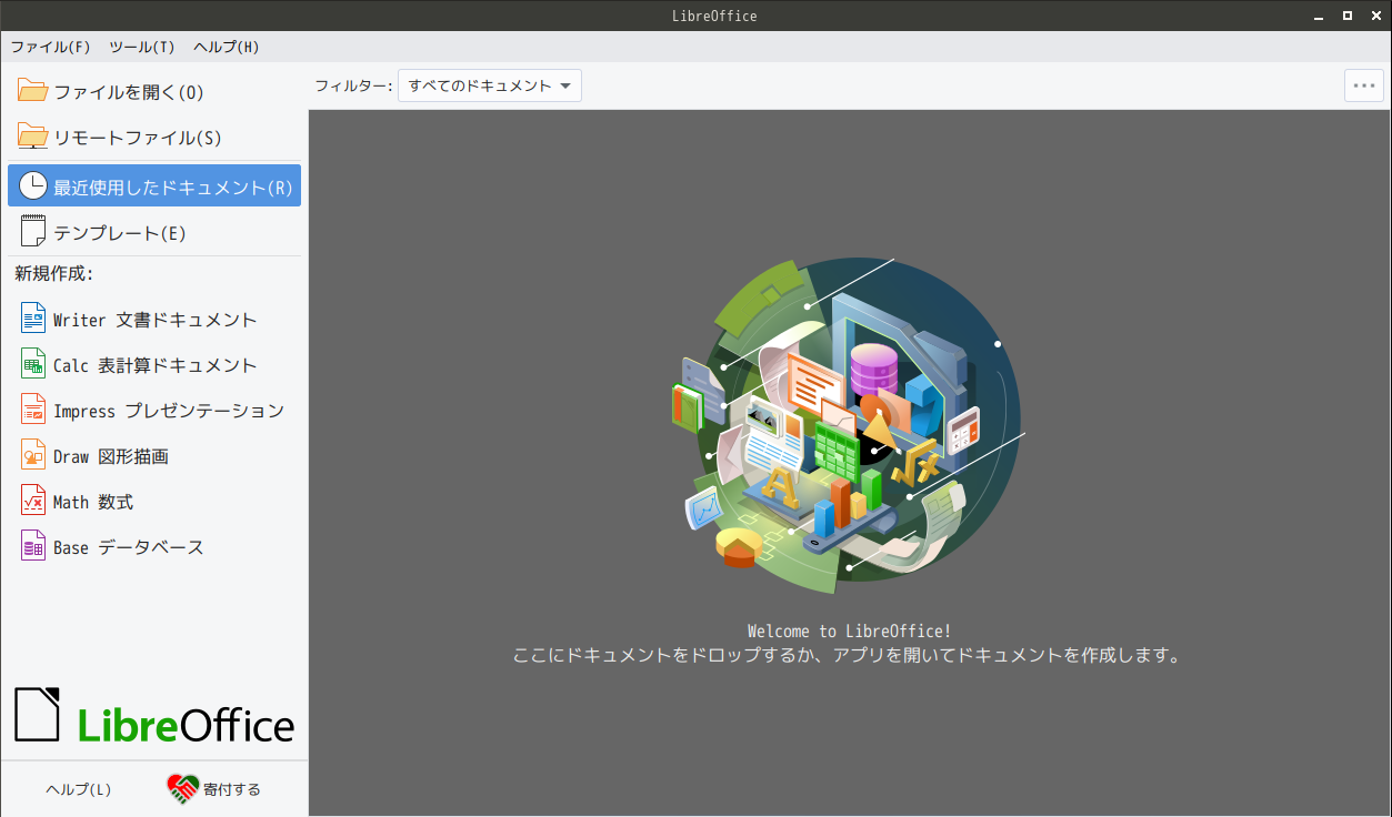 1. 概要 オフィススイートとして「LibreOffice」を使用します。 「LibreOffice」は、デフォルトでインストールされています。 2. 日本語化 インストールされている「LibreOffice」は英語版なので、日本語化する必要があります。 「パッケージインストーラ」で「japanese」を検索して「Japanese_LO_Latest_full」「Japanese_LO_Latest_main」をインストールします。 3. 起動 「スタート」→「アプリケーション」→「オフィス」→「LibreOffice スタートセンタ」