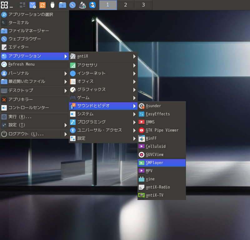 「スタート」→「アプリケーション」→「サウンドとビデオ」→「SMPlayer」
