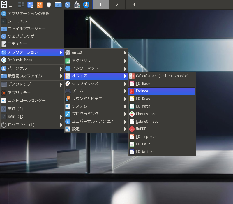 「スタート」→「アプリケーション」→「オフィス」→「Evince」