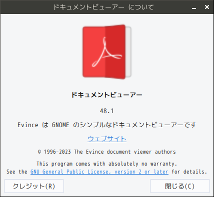 ドキュメントビューア(と言うよりは、「.pdf」ビューア?)として「Evince」を使用します。