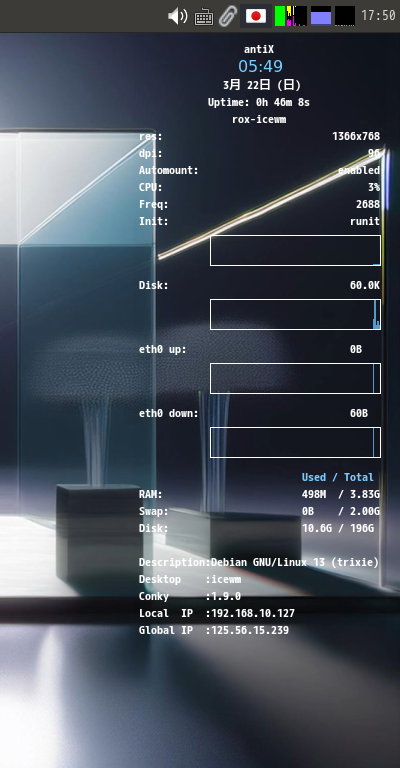 本ディストリビューションでは、「Conky」は、デフォルトで、インストールされ、自動起動も設定されていますので、ログインするとデスクトップ右に表示されています。
