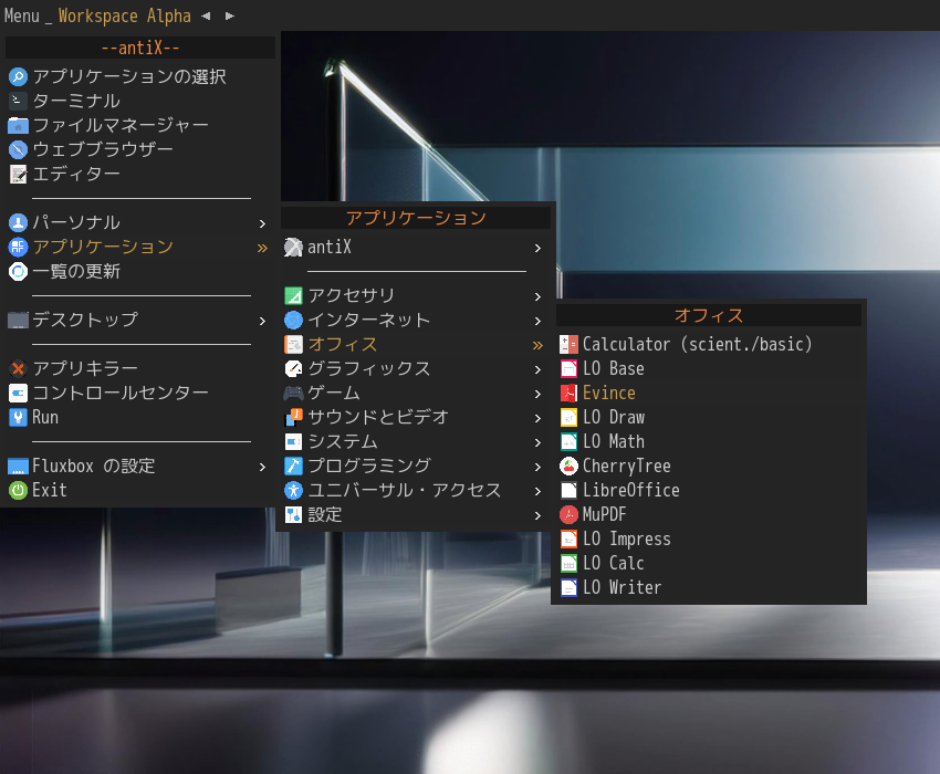 「Menu」→「アプリケーション」→「オフィス」→「Evince」