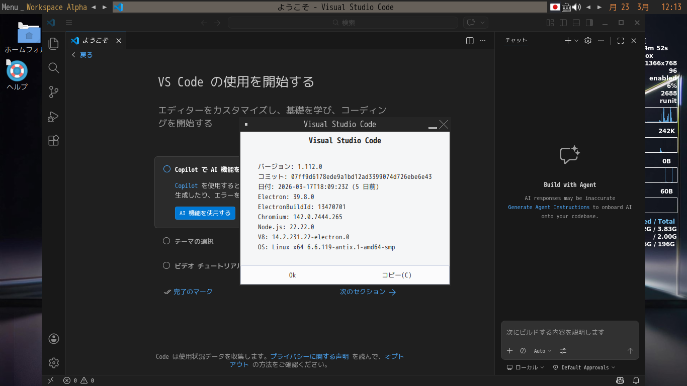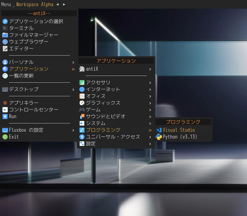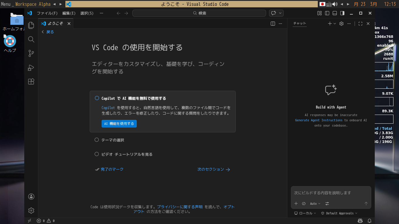 1. 概要 開発環境として、「Visual Studio Code」を使用します。 2. インストール パッケージインストーラで、「vscode」を検索してインストールします。 3. 起動 「Menu」→「アプリケーション」→「プログラミング」→ 「Visual Studio」 (わはは、無理に編集しちゃっているせいか、「Code」が抜けちゃってる)
