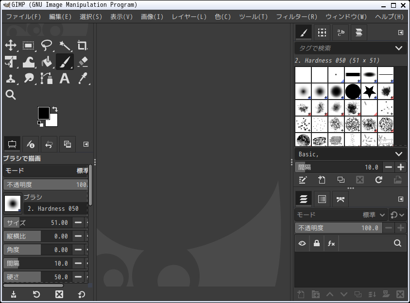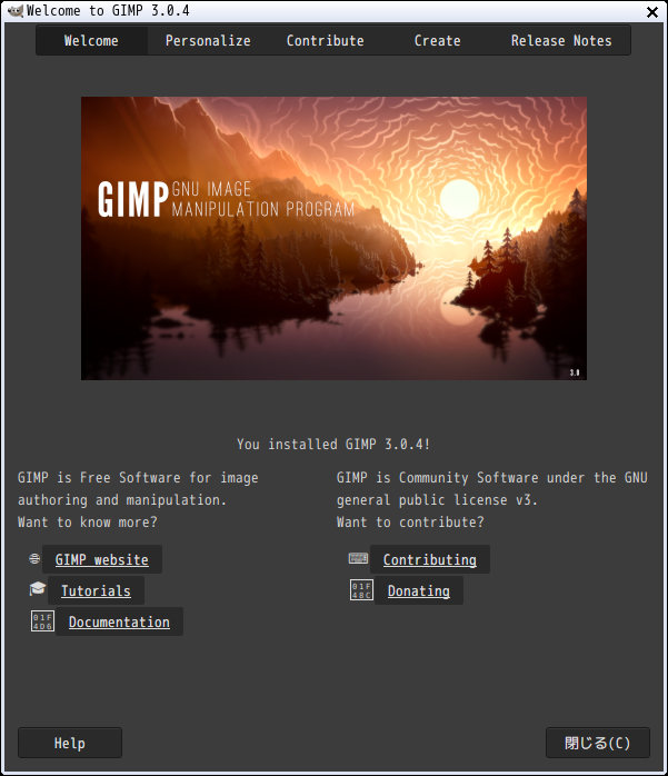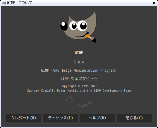 「閉じる」 起動直後の状態です。 2026年3月23日の時点で、下記のバージョンでした。 操作については、「画像編集ソフト - GIMP」に掲載しています。 上記は簡単なものですので、詳細なものがほしい方は、各所に初歩の手引きから応用編までありますので、そちらを参考にしてください。 |