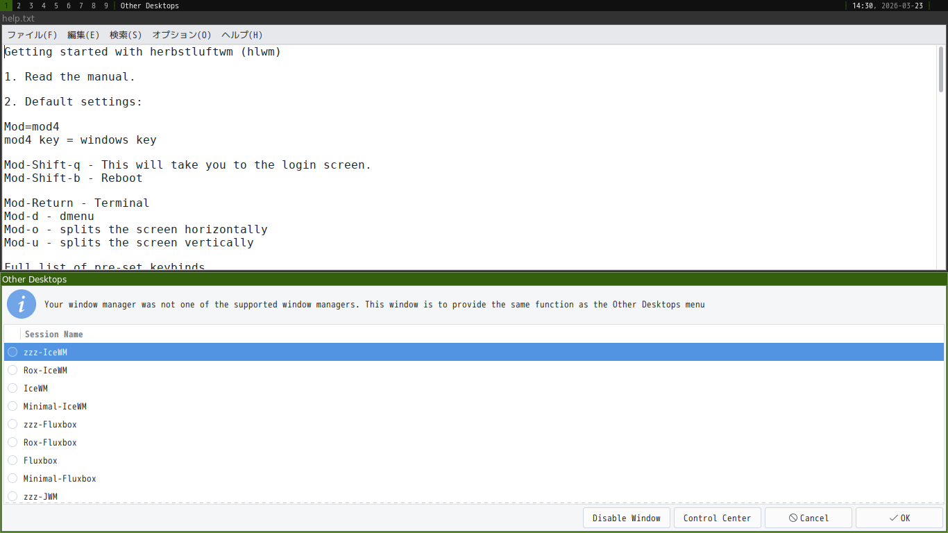 下は、「herbstluftwm」を選択したうえで「Disable Window」で閉じます(それ以外は、何度も表示されてしまう)。