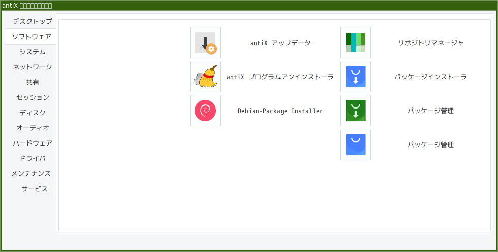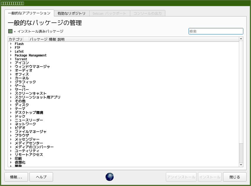 パッケージ管理フロントエンドとして「パッケージインストーラ」「Synaptic」がインストールされています。  「パッケージインストーラ」というのは、「MX Linux」の「MX Package Installer」と同じものです。  基本的に、日本語モジュールと他のデスクトップのインストールには、「パッケージインストーラ」を使用、一般のアプリケーションのインストールには、「Synaptic」を使用するという使い分けがいいと思います。  操作方法等は、「Linux - 共通事項 - パッケージ管理フロントエンド」をご参照ください。