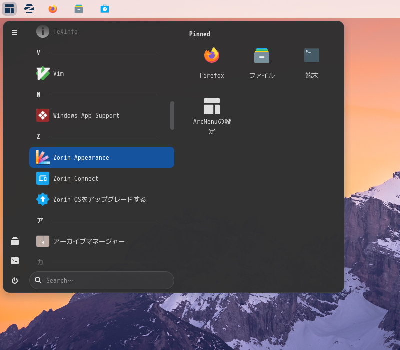 「Arc Menu」を有効化した直後は、左端にいるのですが、ログインしなおすと「Zorin OS」のメニューが左にいるのです。
